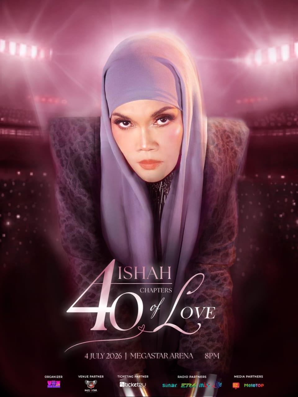 Konsert berjudul “Aishah 40 Chapters of Love” itu bakal berlangsung pada 4 Julai 2026, jam 8.00 malam di Megastar Arena KL, dan ia disifatkan sebagai antara momen paling besar dalam perjalanan seni beliau sepanjang empat dekad.