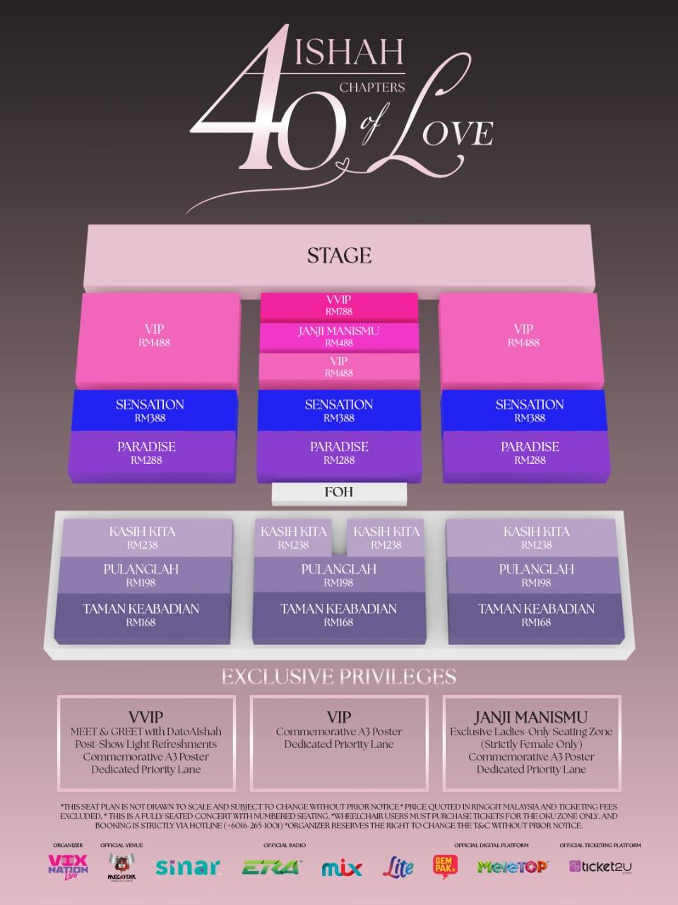 Tiket konsert akan mula dijual pada 17 April 2026, jam 3.00 petang menerusi www.ticket2u.com.my/Aishah40 dengan beberapa kategori termasuk VVIP RM788, VIP RM488, serta beberapa kategori lain mengikut zon tempat duduk.