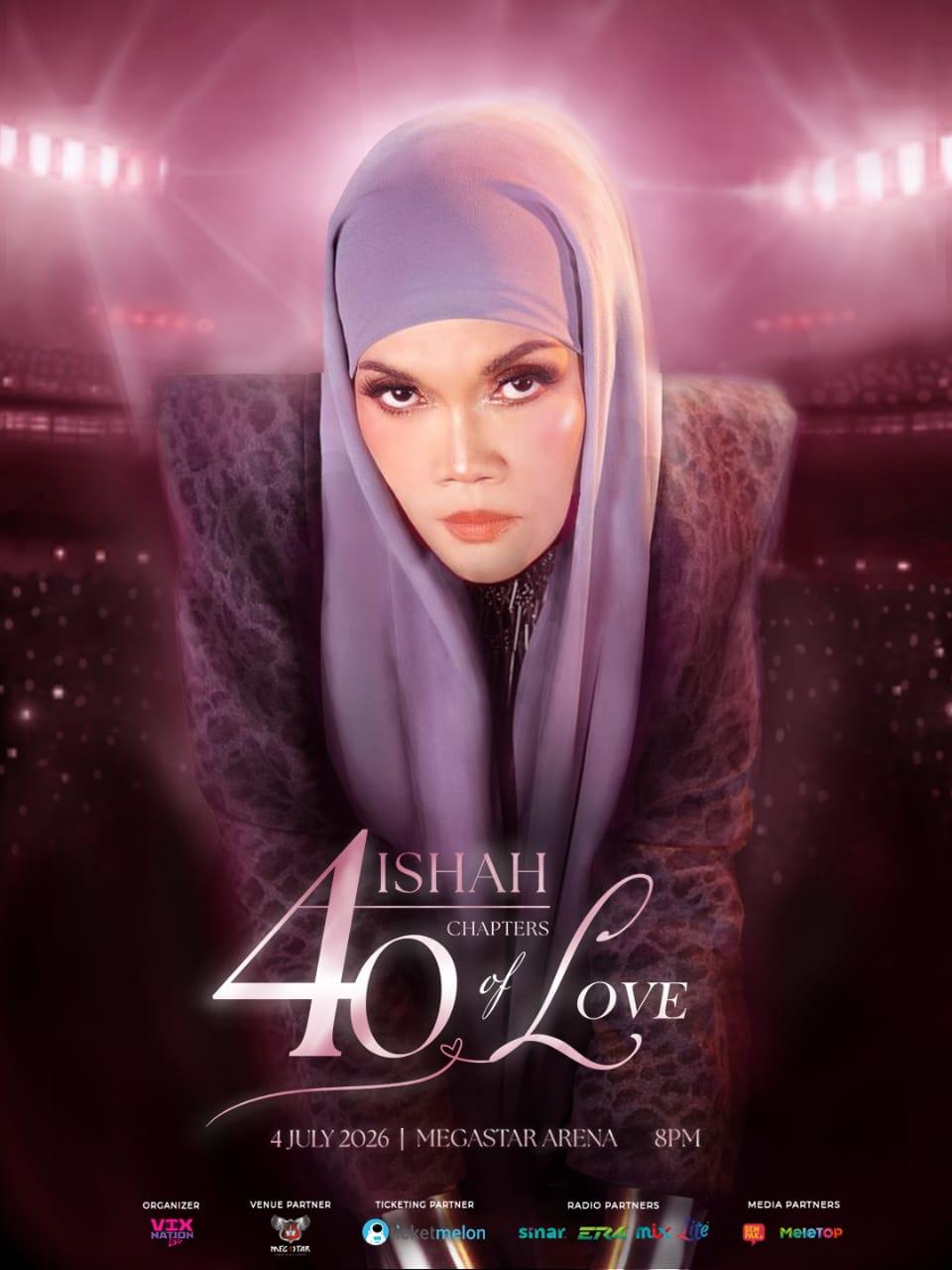 Konsert Aishah 40 Chapters of Love dijangka menjadi malam penuh emosi apabila penonton akan dibawa menyusuri setiap fasa penting perjalanan seni penyanyi berusia 61 tahun itu menerusi konsep penceritaan muzik.