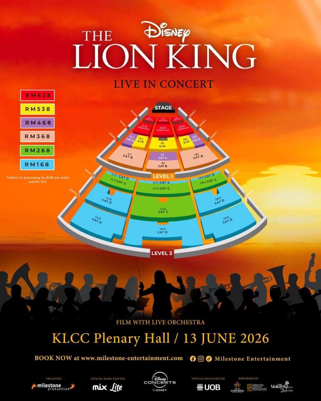 Lupakan pengalaman menonton wayang biasa! Kali ini, The Lion King bukan sekadar muncul di layar, tetapi ‘hidup’ sepenuhnya dengan iringan orkestra secara langsung. Bayangkan bunyi Circle of Life, Hakuna Matata dan Can You Feel the Love Tonight bukan dari pembesar suara tetapi terasa ‘menggoncang’ KLCC Plenary Hall pada 13 Jun 2026 ini.