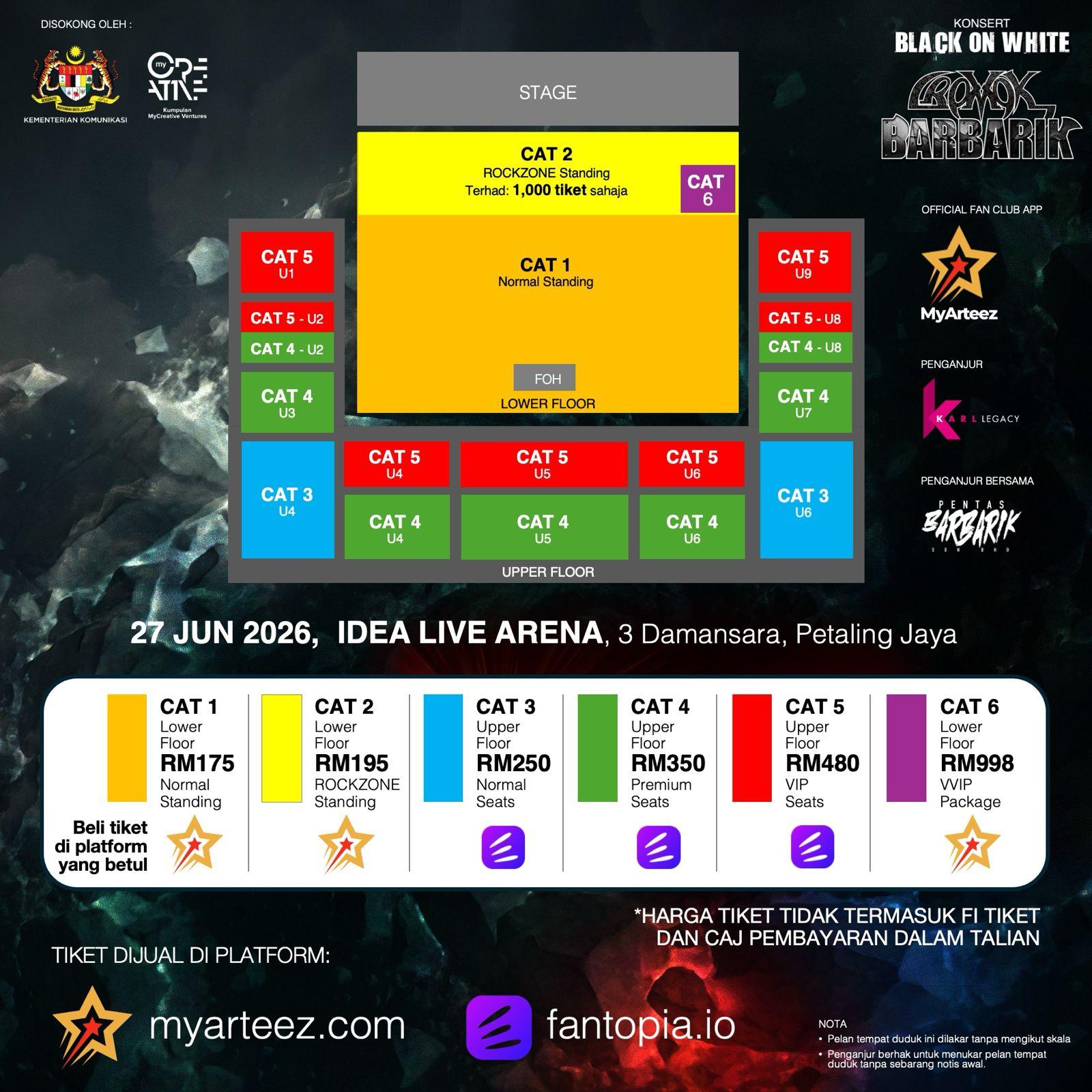 Tiket ditawarkan pada harga RM175 (CAT 1), RM195 (CAT 2), RM250 (CAT 3), RM350 (CAT 4), RM480 (CAT 5) dan RM998 bagi pakej VIP (CAT 6).