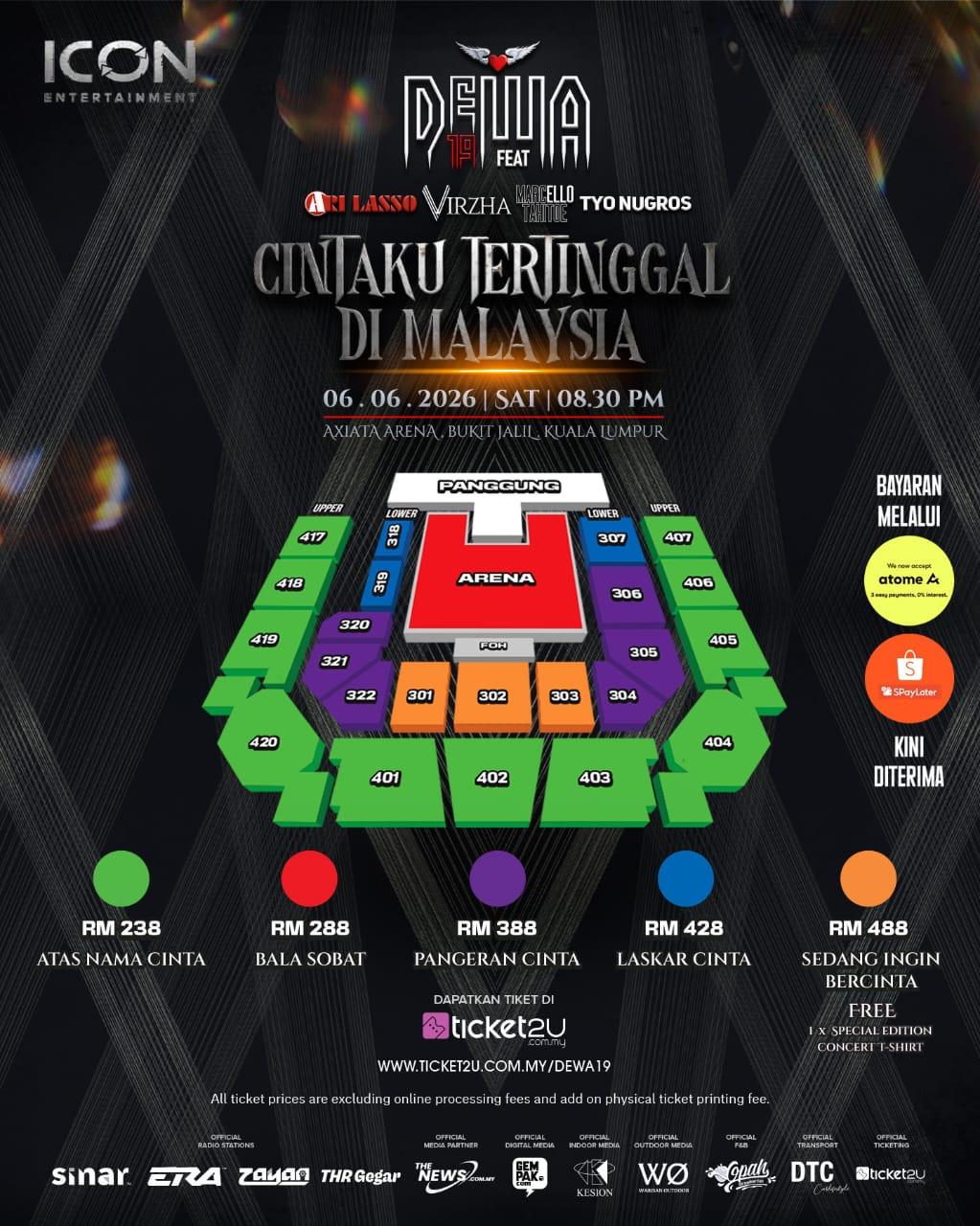 Bagi peminat yang ingin menjadi sebahagian daripada momen bersejarah ini, tiket ditawarkan dalam lima kategori dengan harga CAT 5 – RM238, CAT 4 – RM288, CAT 3 – RM338, CAT 2 – RM388 dan CAT 1 – RM488