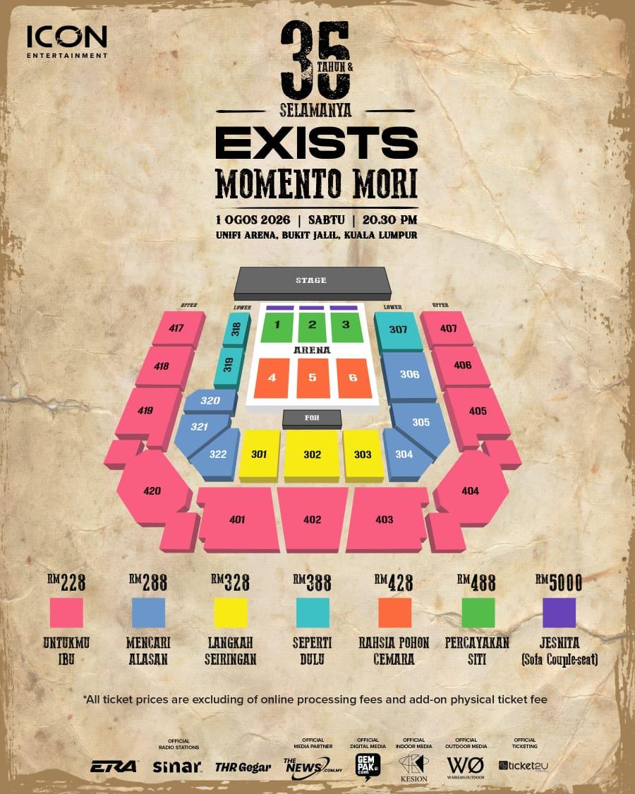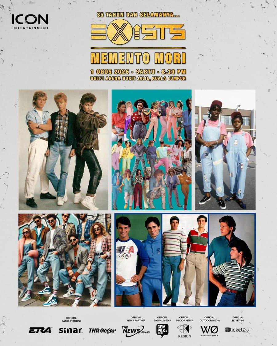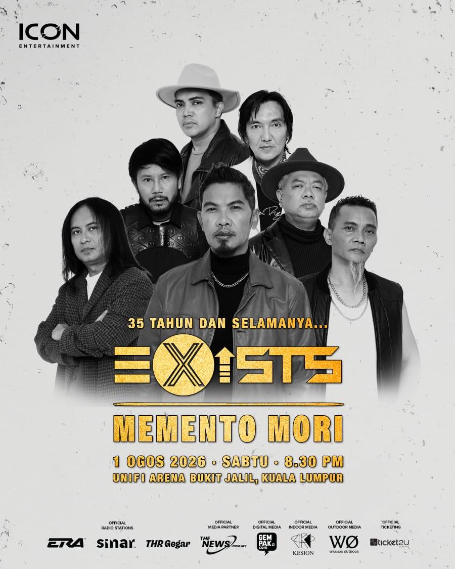 Selepas lebih tiga dekad mewarnai industri muzik tanah air, kumpulan legenda Exists bakal mencipta satu lagi detik bersejarah menerusi penganjuran Konsert Exists Memento Mori yang dijadual berlangsung pada 1 Ogos 2026, jam 8.30 malam di Unifi Arena, Kuala Lumpur.
