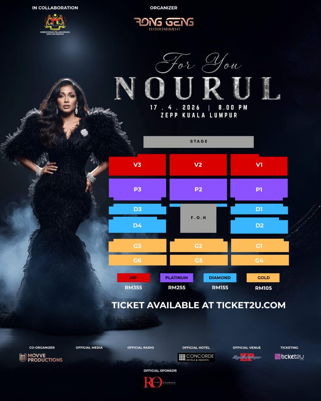 Tiket konsert For You: Nourul ditawarkan pada harga RM105 – GOLD, RM155 – DIAMOND, RM255 – PLATINUM dan RM355 – VIP