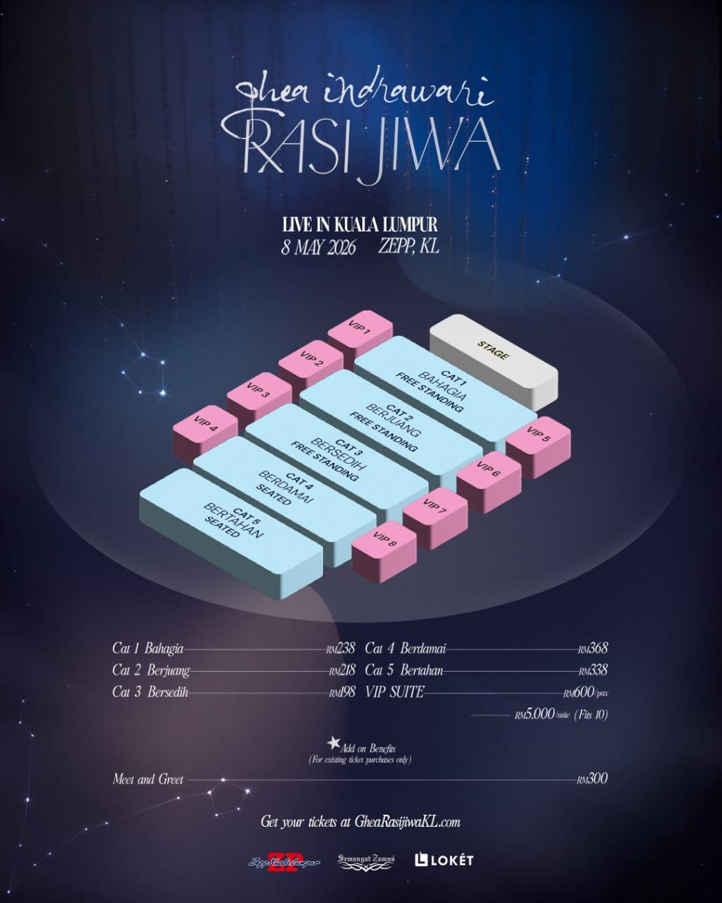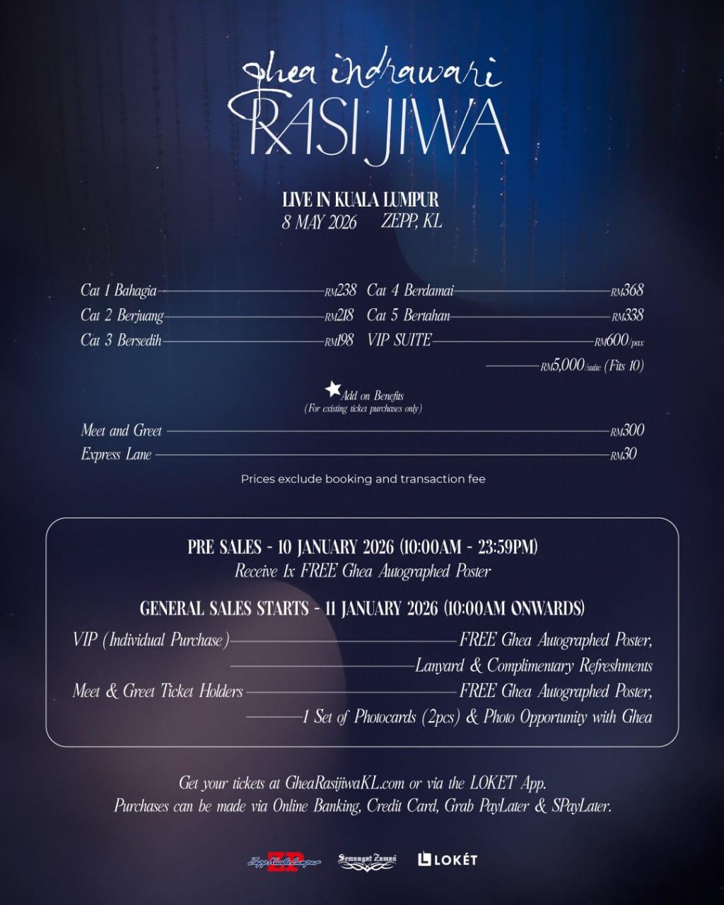 Tiket konsert boleh didapati menerusi laman web rasmi GheaRasiJiwaKL.com serta platform jualan tiket LOKET.