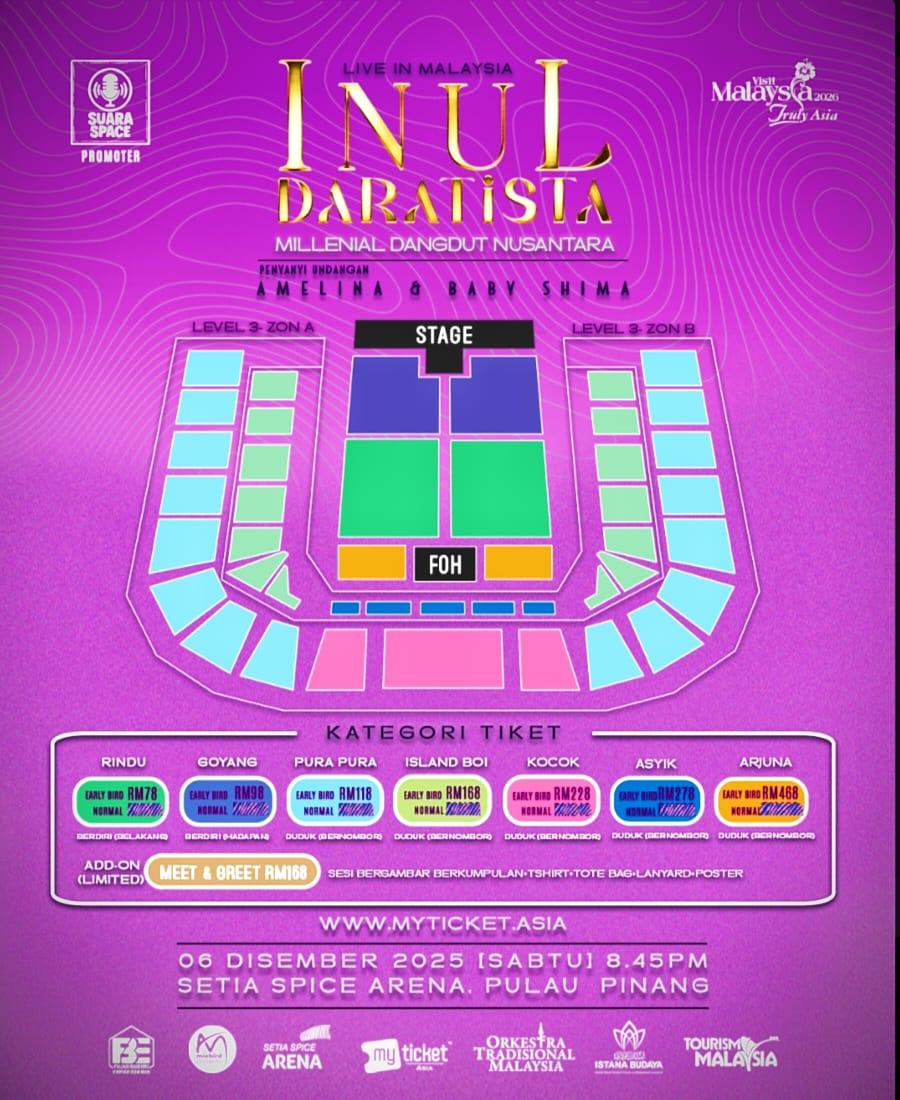 Konsert bertajuk “Inul Daratista Live In Malaysia: Millennial Dangdut Nusantara” itu akan berlangsung di Setia Spice Arena, Pulau Pinang pada 6 Disember 2025, dengan menampilkan persembahan istimewa bersama dua bintang dangdut popular tanah air, Amelina dan Baby Shima.