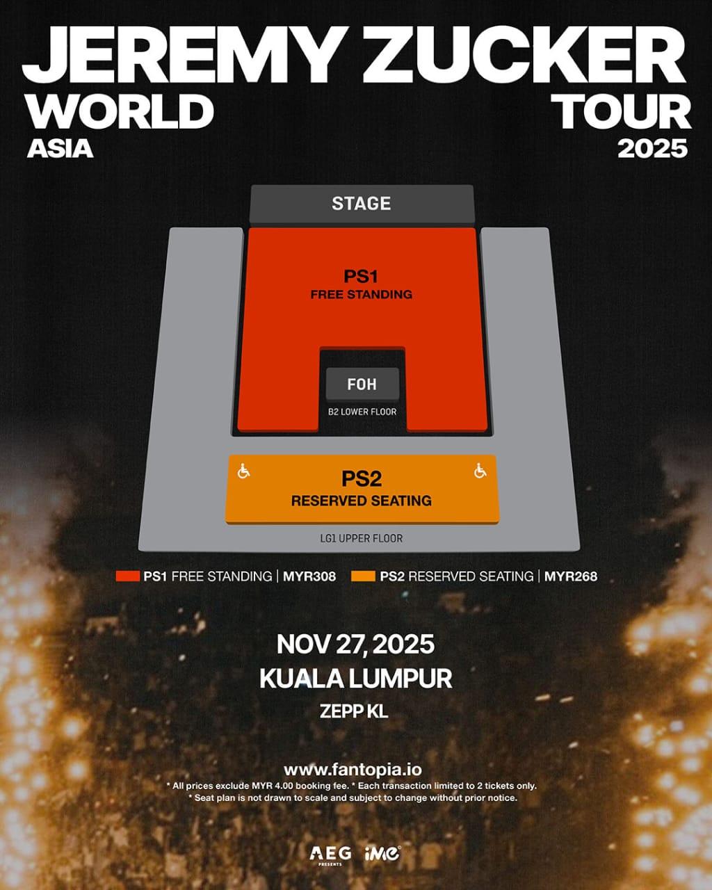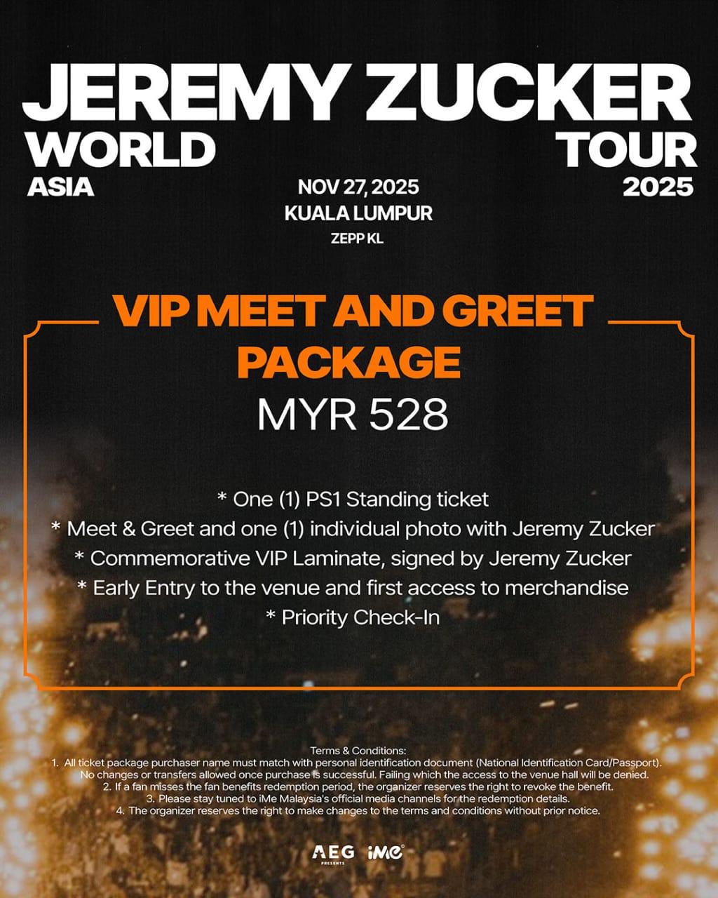 Untuk peminat di Malaysia, Jeremy Zucker – World Tour 2025 akan singgah di Zepp Kuala Lumpur pada 27 November 2025. Konsert ini dianjurkan oleh AEG Presents Asia dan iMe Malaysia. Tiket mula dijual pada 15 September 2025 (Isnin), jam 10 pagi MYT menerusi www.fantopia.io.