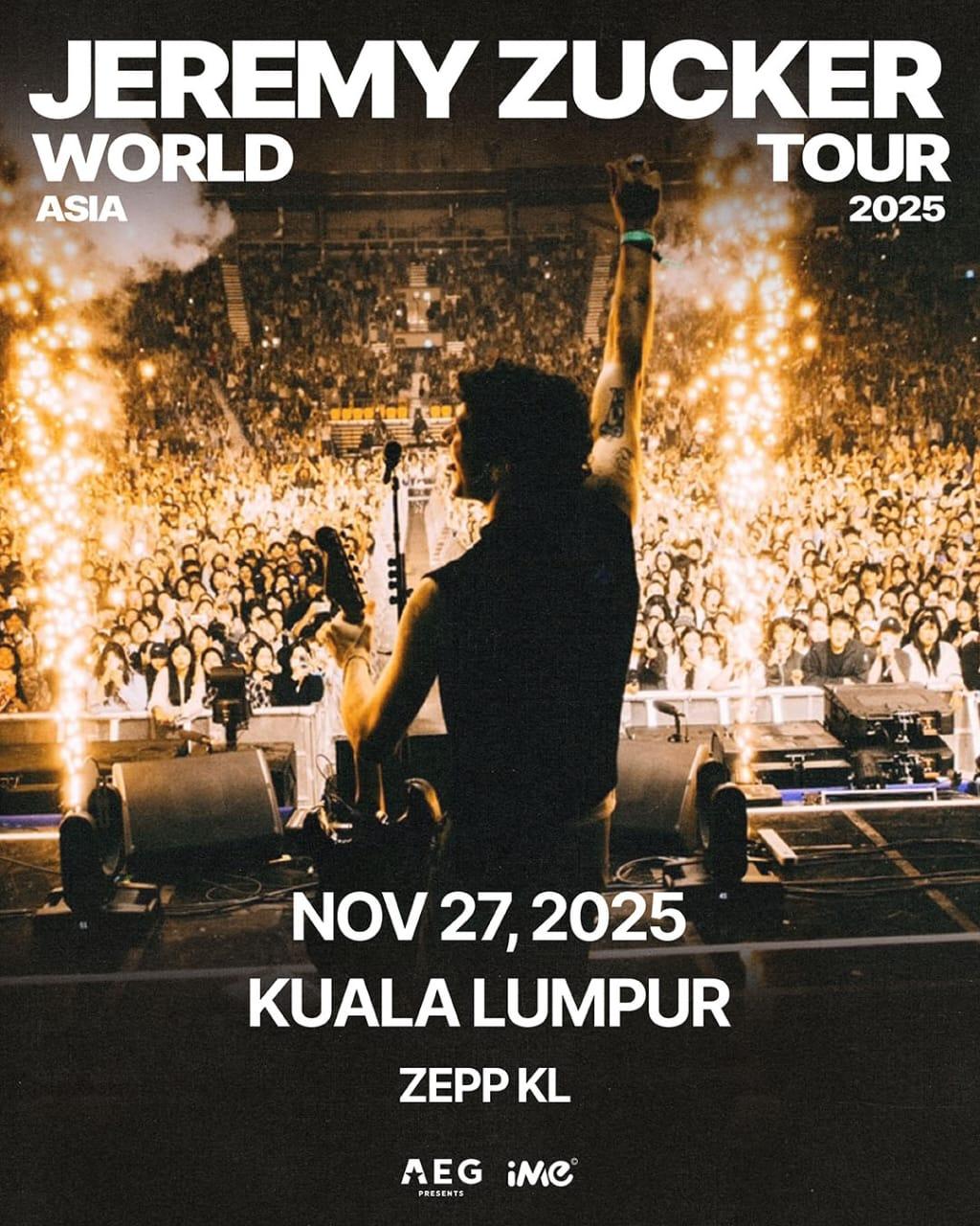 Bintang pop alternatif yang juga penyanyi, komposer dan penerbit multi-platinum, Jeremy Zucker, bakal kembali menghangatkan pentas Asia melalui siri jelajah globalnya, 2025 World Tour. Siri konsert ini menjanjikan pengalaman muzik yang intim namun penuh bertenaga, dengan hentian di Seoul, Singapura, Kuala Lumpur, Manila, Taipei dan Tokyo.