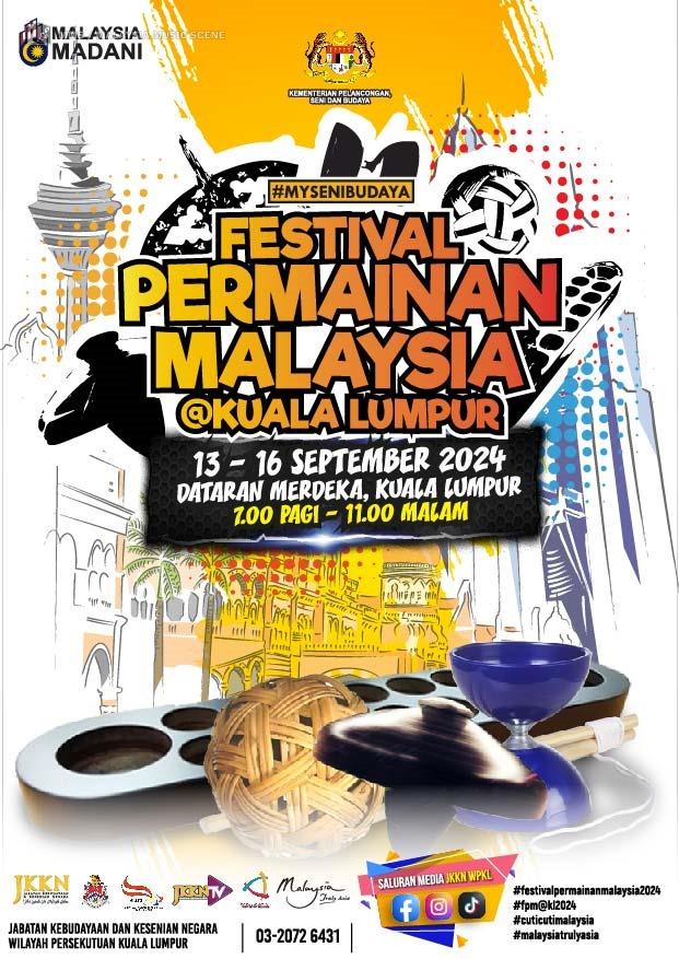 Festival Permainan Malaysia@ Kuala Lumpur yang memasukki edisi ke-9 terus diperkasakan oleh Jabatan Kebudayaan dan Kesenian Negara (JKKN) Wilayah Persekutuan Kuala Lumpur. Justeru itu orang ramai dijemput untuk memeriahkan (FPM@KL 2024) yang turut dianjurkan bersama Dewan Bandaraya Kuala Lumpur (DBKL). Festival itu akan berlangsung dari 13 hingga 16 September di Dataran Merdeka, Kuala Lumpur.