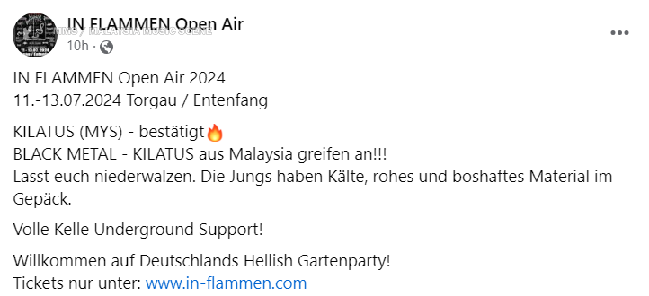 Pengumuman penganjur In Flammen Open Air 2024 dalam bahasa Jerman yang mengatakan bahawa Kilatus disahkan akan membuat persembahan pada pesta tersebut.