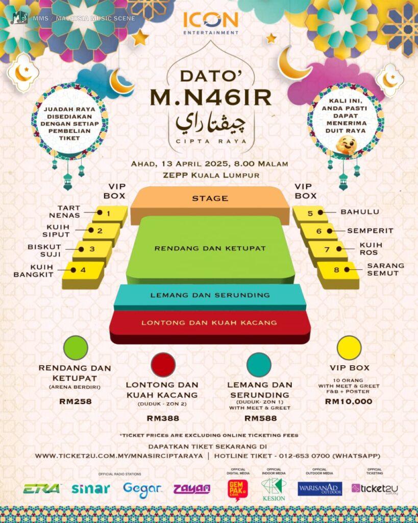 Malah, bagi peminat tegar yang ingin merasai pengalaman lebih istimewa, pakej eksklusif VIP Box berharga RM10,000 turut ditawarkan, lengkap dengan akses eksklusif ke rumah terbuka khas bersama M. Nasir serta pelbagai barangan cenderahati istimewa.
