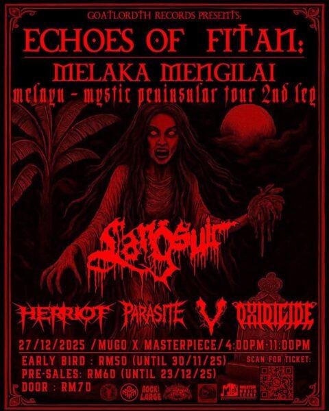Langsuir, ikon metal ekstrim bawah tanah Malaysia, bakal menggempur pentas ekstrem menerusi konsert “Echoes of Fitan: Melaka Mengilai” pada 27 Disember 2025 di Mugo x Masterpiece, Melaka. Konsert ini merupakan salah satu hentian dalam siri jelajah kumpulan tersebut yang dikenali sebagai Melayu-Mistik Peninsular Tour (Second Leg), yang dianjurkan oleh Goatlordth Records.