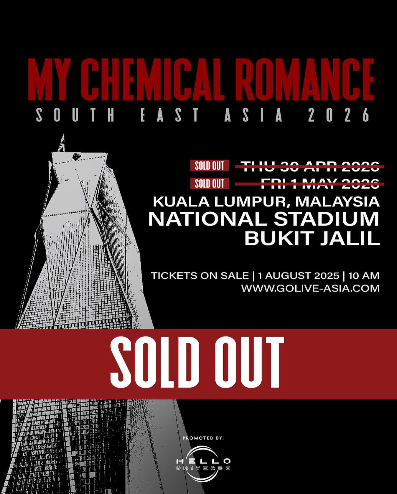 Fenomena My Chemical Romance (MCR) kembali menggoncang Malaysia apabila tiket malam kedua konsert mereka di Stadium Nasional Bukit Jalil pada 1 Mei 2026 habis terjual hanya dalam beberapa jam selepas dibuka hari ini. Konsert ini merupakan sebahagian daripada MCR South East Asia Tour 2026, dan kini secara rasmi menjadi persembahan berskala terbesar pernah dianjurkan di Asia Tenggara oleh band antarabangsa dengan jumlah keseluruhan penonton mencecah 120,000 orang.