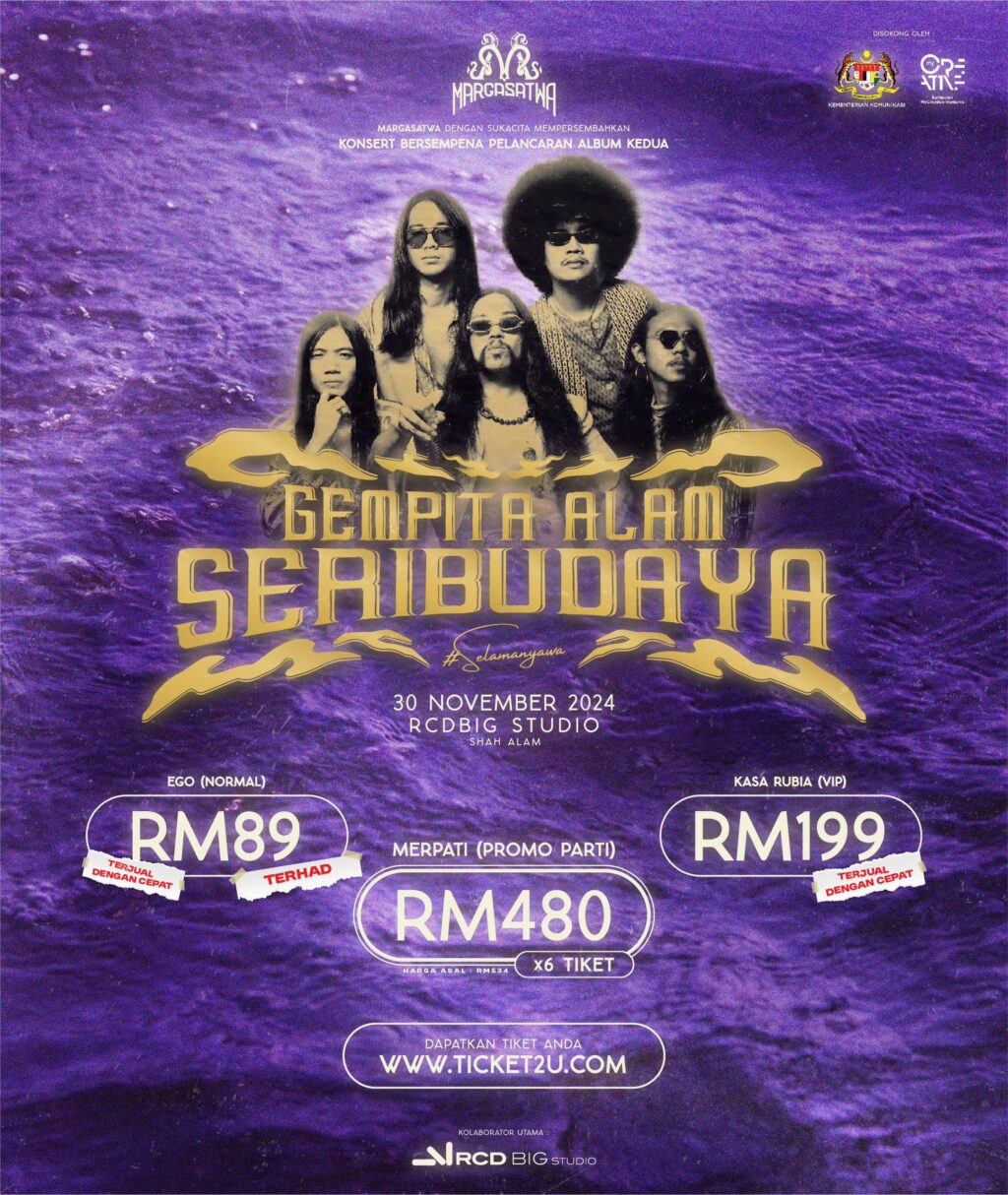 Laman tiket: Tiket berharga RM80. RM89 dan RM199 boleh didapatkan di https://www.ticket2u.com.my/event/38016/margasatwa-album-launch-concert-gempita-alam-seribudaya.