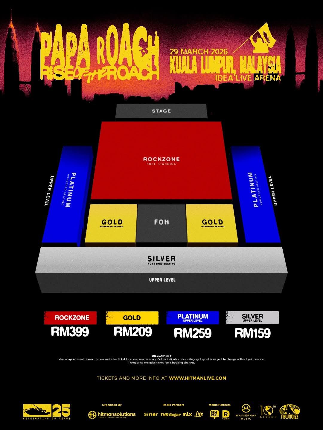 Tiket akan mula dijual kepada umum pada 28 Januari 2026, jam 12 tengah hari, menerusi www.hitmanlive.com. Peminat juga boleh mendapatkan pakej VIP eksklusif melalui laman rasmi jelajah Papa Roach.