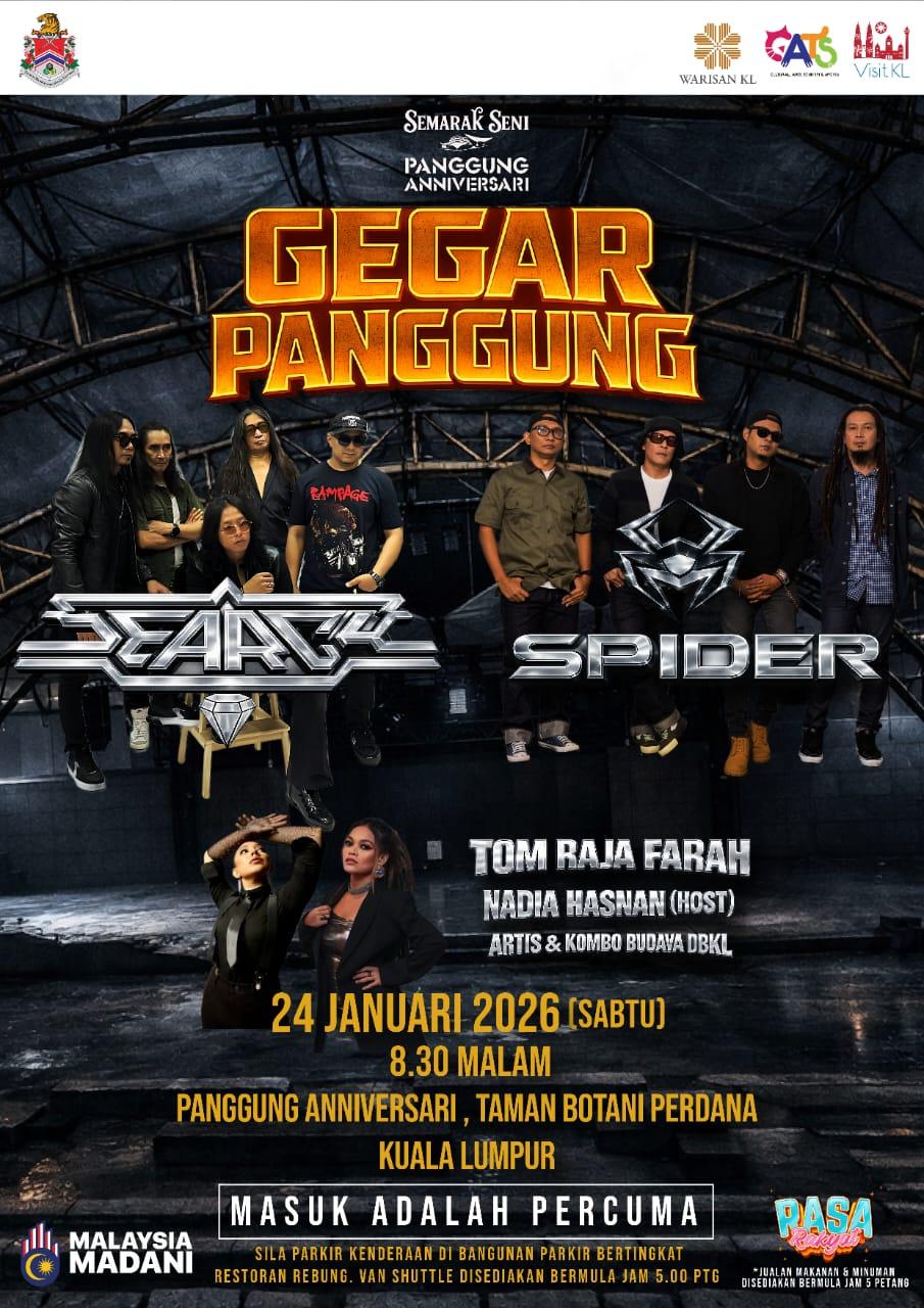 Dua nama besar rock tanah air, SEARCH ‘Kiddin’ dan SPIDER, bakal bergandingan dalam sebuah acara muzik istimewa bertajuk GEGAR PANGGUNG, anjuran Dewan Bandaraya Kuala Lumpur (DBKL) menerusi Jabatan Kebudayaan, Kesenian, Pelancongan dan Sukan (JKKPS).