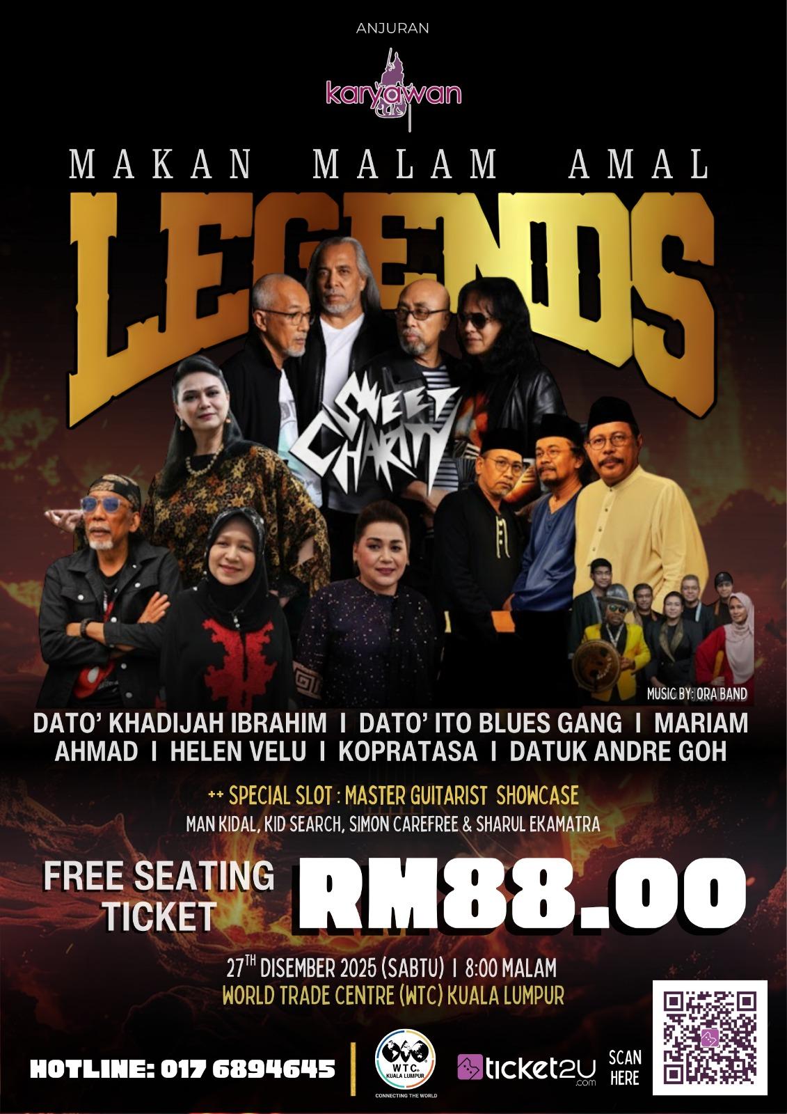 Persatuan Karyawan Malaysia (Karyawan) bakal menganjurkan Konsert Makan Malam Amal The Legends pada 27 Disember ini di Pusat Dagangan Dunia Kuala Lumpur (WTC Kuala Lumpur), menampilkan persembahan selama empat jam oleh barisan legenda muzik tanah air dalam usaha mengumpul dana bagi membantu artis dan penggiat seni yang memerlukan.