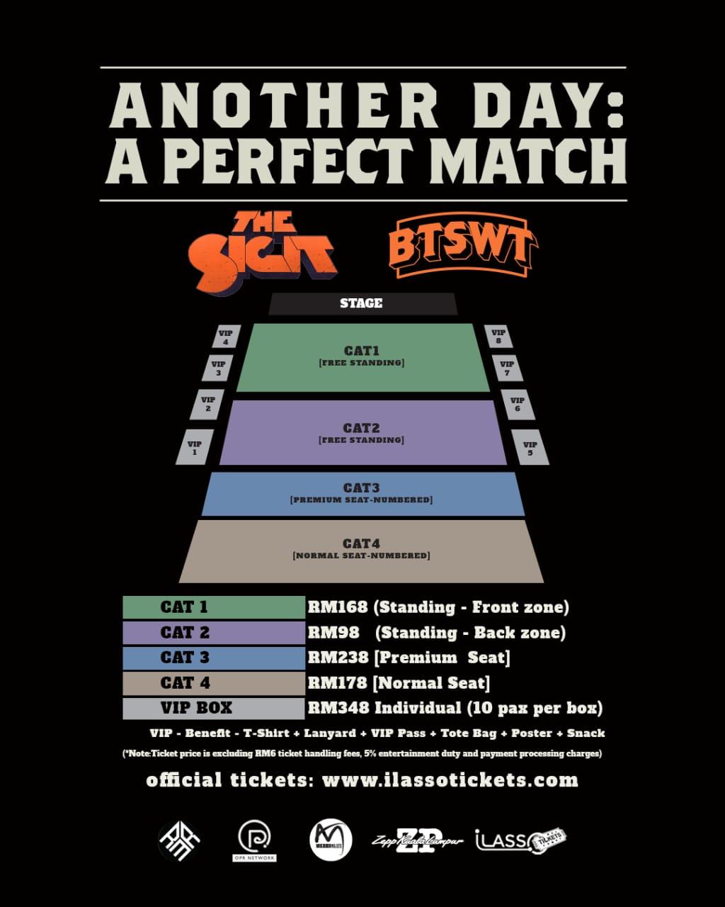 Harga Tiket yang ditawarkan adalah RM168 – CAT 1 (Berdiri – Zon Depan) , RM98 – CAT 2 (Berdiri – Zon Belakang), RM238 – CAT 3 (Tempat Duduk Premium), RM178 – CAT 2 (Tempat Duduk Biasa) dan RM348 – KOTAK VIP (10 orang setiap kotak) serta VIP Eksklusif: T-Shirt, Lanyard, Pas VIP, Beg Tote, Poster & Snek
