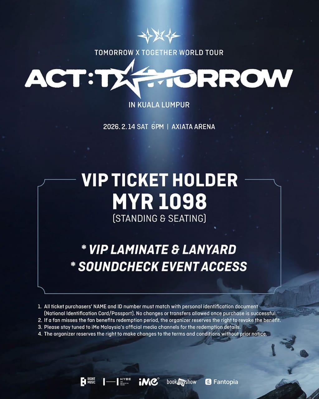 Dibawakan khas oleh iMe Malaysia, konsert yang diberi nama TOMORROW X TOGETHER WORLD TOUR <ACT : TOMORROW> IN KUALA LUMPUR dijangka menjadi antara persembahan paling dinantikan tahun hadapan, apatah lagi ia berlangsung sempena sambutan Hari Valentine — menjanjikan malam penuh magis buat peminat.