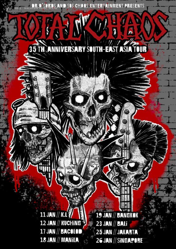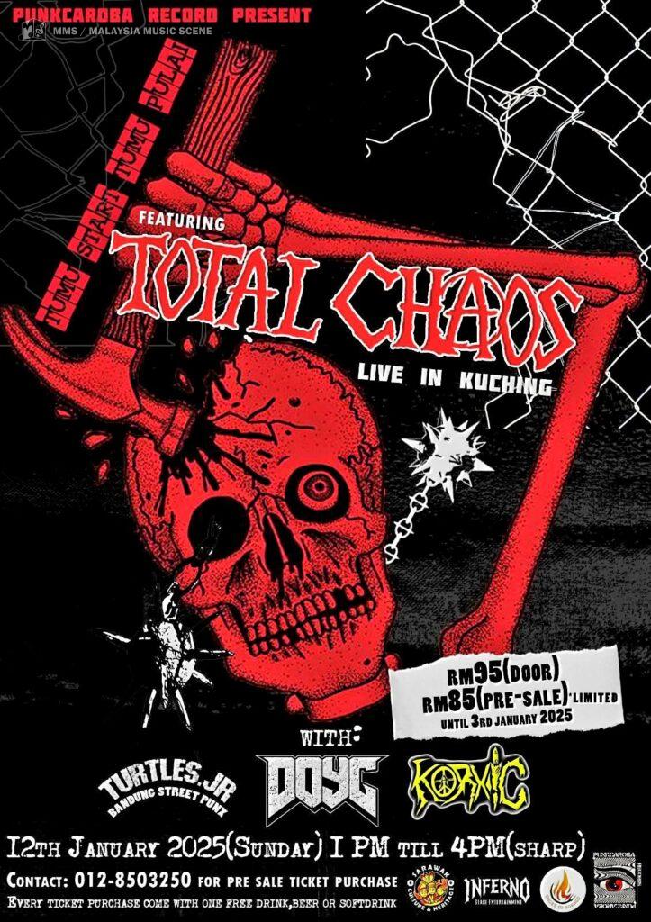 Peminat punk rock di Kuching, bersedia! Total Chaos, band legenda dari Amerika Syarikat, akan membuat persembahan secara langsung pada 12 Januari 2025 di Smoke of Borneo, Jalan Penrissen, Kuching, Sarawak. Acara ini turut menampilkan Turtles.Jr, band street punk ikonik dari Bandung, Indonesia, bersama beberapa band tempatan terbaik dari Kuching, termasuk Korxic dan Dance on Your Grave!