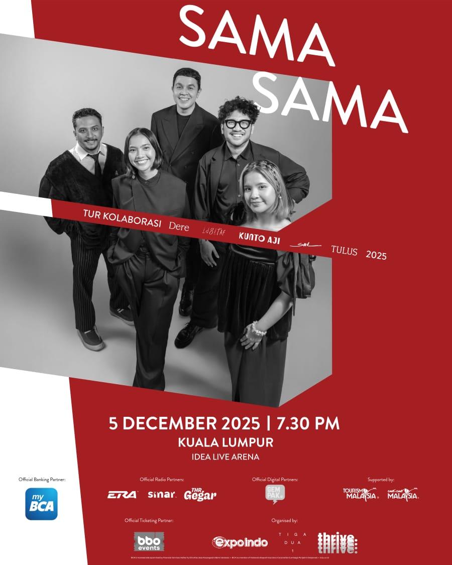 Sebuah janji akhirnya ditepati. Lima figura besar muzik Nusantara iaitu Tulus, Kunto Aji, Dere, Sal Priadi, dan Idgitaf bakal bersatu di pentas Tur SAMA SAMA yang akan berlangsung di Idea Live Arena, Kuala Lumpur pada 5 Disember 2025.