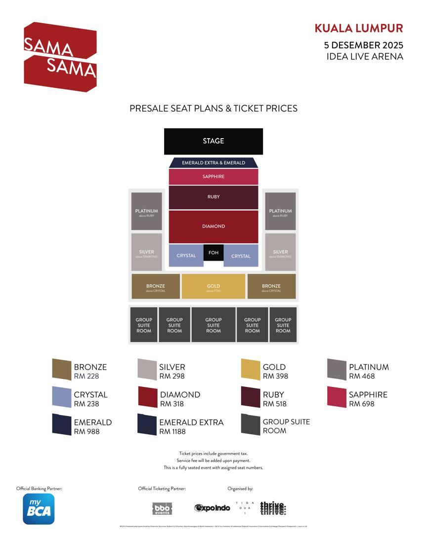 Sebanyak 11 kategori tiket ditawarkan: Bronze, Crystal, Silver, Diamond, Gold, Platinum, Ruby, Sapphire, Emerald, Emerald Extra dan Group Suite.