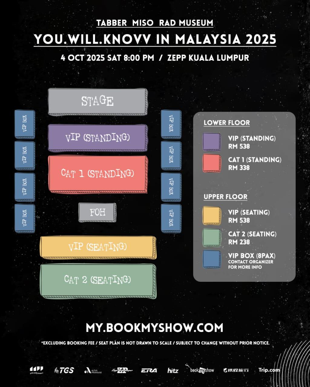 VIP (Berdiri & Tempat Duduk): RM538, CAT 1 (Berdiri): RM338 dan CAT 2 (Tempat Duduk): RM238. Sementara untuk VIP BOX: Hubungi penganjur melalui DM media sosial atau WhatsApp +6012-816 2218.