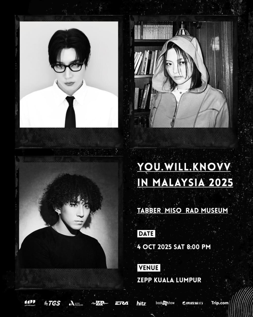 Dianjurkan oleh TopGallant Show, konsert you.will.knovv in Malaysia 2025 akan berlangsung pada 4 Oktober 2025 (Sabtu), jam 8 malam di Zepp Kuala Lumpur, menampilkan tiga bintang utama label tersebut – Tabber, Rad Museum dan Miso.